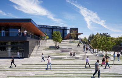 A near-acre-sized public plaza features “The Grand Staircase” that cascades down the side of a building, forming landscaped terraces and seating. Also called the Culver Steps, it connects to a four-story, mixed-use building occupied by Amazon. The entire plaza sits over a new, two-level, underground parking garage.