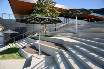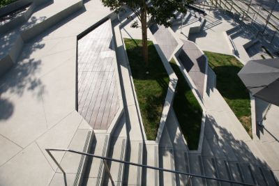 Shaw & Sons also installed 13,763 cubic feet of EPS foam under the steps and paved 11,043 square feet of surrounding sidewalks. In addition, instead of using the specified Ipe wood, the company used a fine-wood, plank-finished concrete.