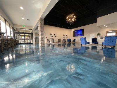 Built in an old grocery store, the owner opted for a two-toned look that felt like water, with a few added highlights. The mixing crew from Decorative Concrete of Virginia alternated between three-gallon batches of dark and light blue, followed by a three-quart batch of white to have plenty of time to blend the colors. 150 gallons of the metallic coat were mixed for the job and the 8,000 SF project was placed in one pour.