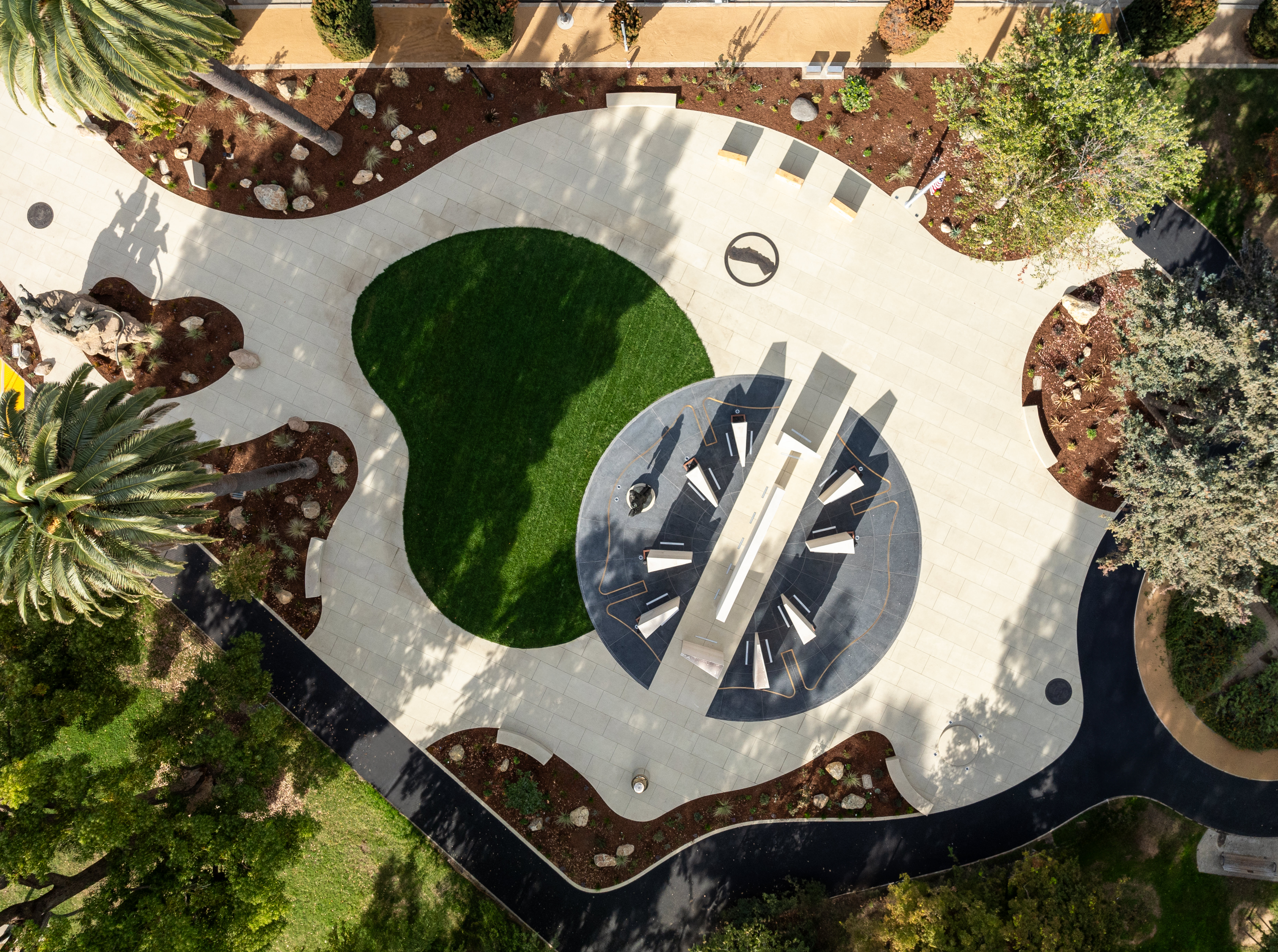 Integrated into the flatwork are bronze inlays and discreet lighting elements, designed to enhance the visitor experience without distracting from the solemn purpose of the space. Additional features include radiused concrete benches, circular pedestals with bronze inlays, and sign walls with template-sandblasted text. All vertical concrete elements were cast using the same custom white mix, ensuring a cohesive and elegant design throughout.