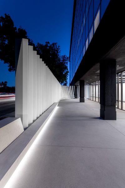 The budget wouldn’t allow for white cement so Trademark used Scofield White Ash color hardener. The coloring produced striking results, coupled with a lighting system that illuminates the art installation at night.