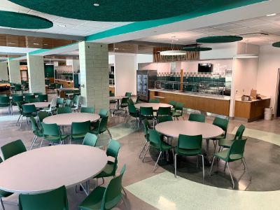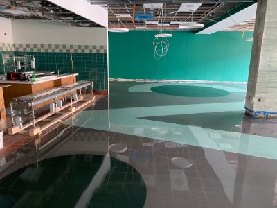 Instead of removing and replacing the cement terrazzo floor at the Seton High School cafeteria, Hardig Industrial installed a polished concrete overlay. The original specification called for a decorative stain but the team explored integral color and revised the scope. Custom pigments were made, custom forms were cut with a water-jet, and the layout was poured in a three-color process.