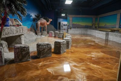 SeaQuest consists of eight or nine different themed areas featuring 12 different colors of metallic epoxies, all poured wet-on-wet, a method which produces no hard seams between colors.