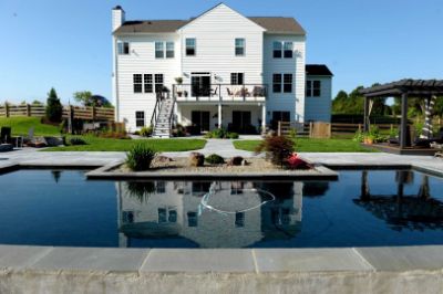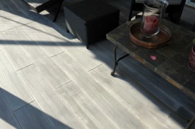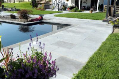 Coming up with a contemporary design to suit the surroundings was the second challenge. The customer wanted to carry their contemporary interior style out to the pool deck. Bluestone pool coping was already in place and had to stay. We used the basic color of the coping, but created an extra-large “quarry block” style stone pattern. We stained alternating tiles in subtly different colors tones to maintain an elegant and natural look. Finally, the customer wanted something unique under the deck. They had just had gray hardwood laid in the basement, somewhat driftwood style. We were able to match it reasonably well in an area outside of the basement doors. Customer loved their total transformation from aggregate gone bad to a beautiful Contemporary Summer Retreat.