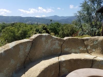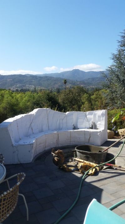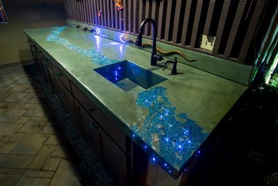The bench was constructed over a foam base using peat moss and sea sponges to create the lichen and multiple colors for the rocks. The fire pit includes custom bronze snakes with LED eyes imbedded into a filled glass mold. Larger bronze snakes adorn the countertops and backsplashes made with green color hardener and with numerous steel tube conduits running through them. Countertops have blue veins and over 300 individual fiber optics that were a tremendous challenge to construct. The owners were ecstatic with the year long effort. Judges were impressed with the intricate details, and the ability to create something never seen before.