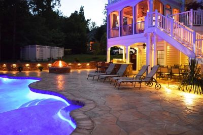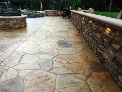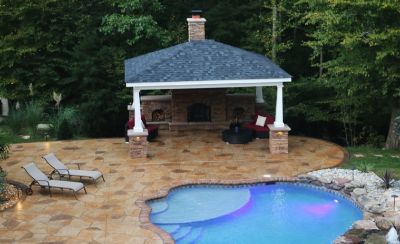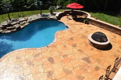 This project consisted of a stamped concrete pool deck with custom fireplace, fire pit, outdoor kitchen, pavilion, sitting and retaining walls.
