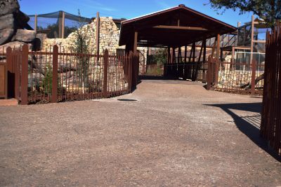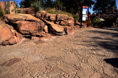 As visitors enter the exhibit they come through a recreated arroyo. The Garden Stone pattern, with natural English slate texture, consists of varying sizes of stones ranging from½" x 1" to 15" x 21", providing a realistic approach to replicating the desert rock riverbed landscape from boulders to small pebbles. A total of 15,000 square feet of imprinted concrete was installed using sand integral color for the base and varying color hardeners of autumn brown and forrest brown. A clear sealer was applied for protection.