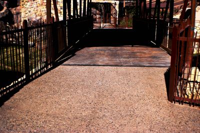 Walking paths invite visitors to pass beneath two abandoned bridges that allow jaguars to cross between the mountain and their exhibit spaces. The native desert trail of 850 SF is a natural exposed aggregate concrete finish that winds its way in and out of the area. The 6" random boardwalk pattern was used with autumn brown color hardener and walnut brown release agent. To give it a worn, aged look, accents in forest brown were added, then the 717 SF of textured and imprinted concrete was given a final seal.