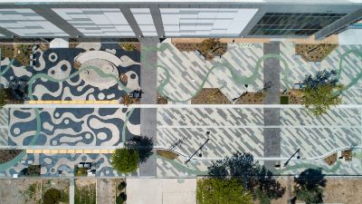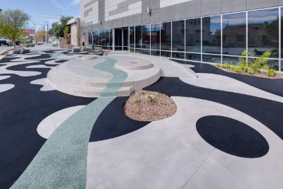 T.B. Penick & Sons had the pleasure of collaborating with Las Vegas Paving and Southwick Landscape Architects on this project to achieve the city's design-intent. The paving patterns colors, and materials were identified early on as a main design element. The street was being narrowed and the sidewalks widened to promote a more walkable space and enhance aesthetics. This portion of 3rd Street is adjacent to the Arts District, with a theater in the middle of the project, so color and pattern were encouraged on every element of design.