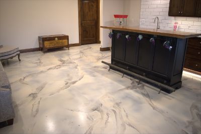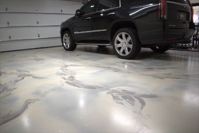 This project included a SunMetal application to an approximately 2400 SF full basement and a three-bay garage slab-on-grade for a $2 M+ custom home. Knox Concrete shotblast, prepped and applied an MVB primer and a custom metallic "antiqued marble" design to fit the homeowner's Tuscan theme. Most difficult was coordination with other trades to not contaminate the area. The homeowner had interesting color suggestions, including a white base with off-white accents, silver veining and Himalayan salt pink for the light accents. Knox was worried about the pink, however it added a nice complimenting color. All in all a remarkably successful project with a very satisfied owner.