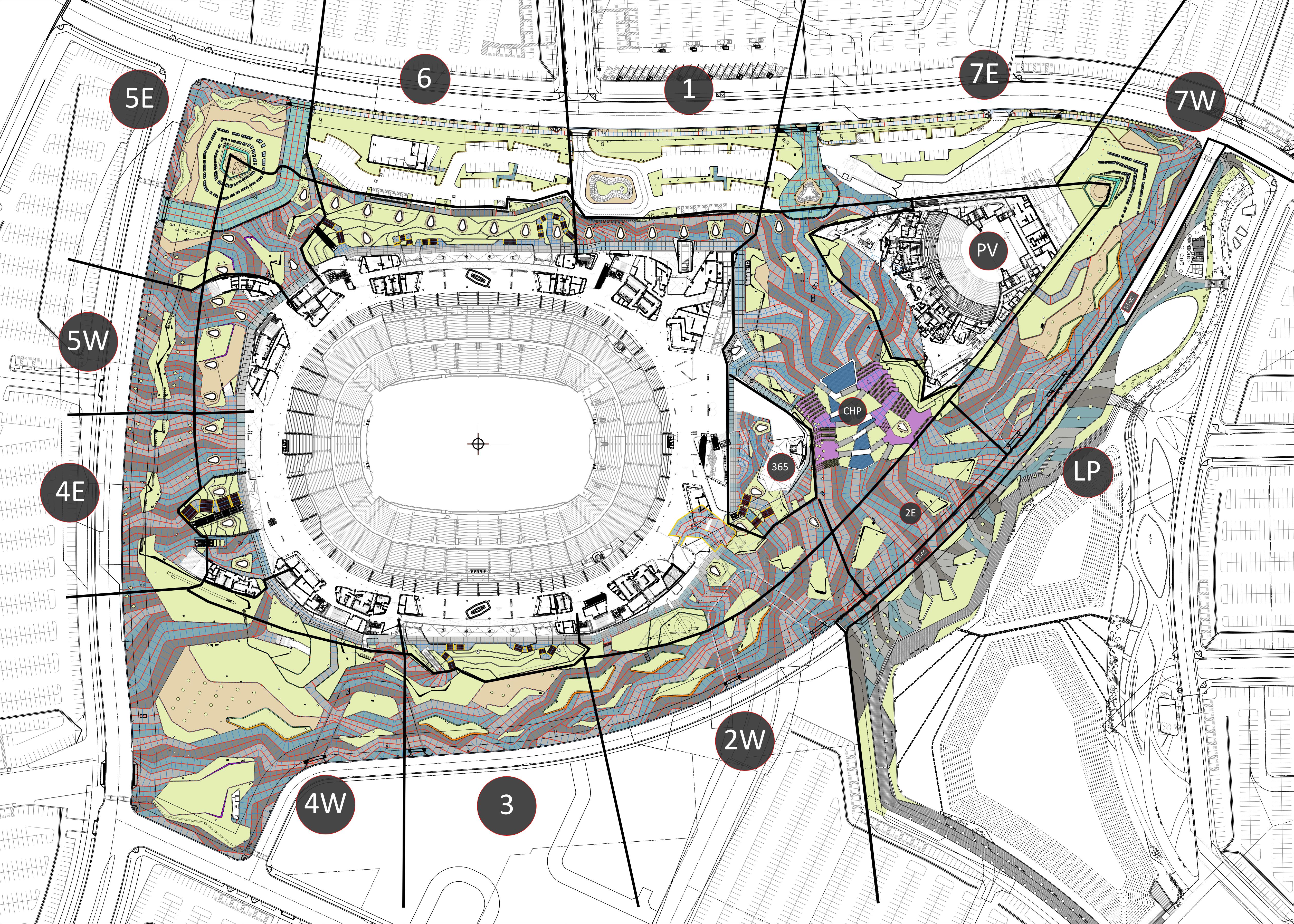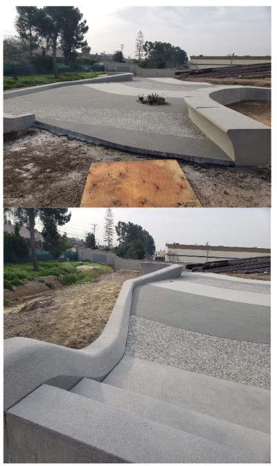 The sheer size of this project is unique; nothing this large having ever been developed in the Los Angeles decorative concrete market. As with the over 720,000 SF of decorative paving, everything on this project was on a whole other scale. Trademark truly learned what they were capable of, stretching decorative concrete flatwork placements to 300 CY, a day, back-to-back, while maintaining consistent surface retarder finishes. The stadium roof structure anchors to the ground at three locations around the site, called abutments. At each abutment is a unique 14' wall with batters ranging from 11-39 degrees and consisting of a surface retarder finish. Most of the vertical elements did not have of a 90-degree vertical face; most walls utilized custom cut foam to achieve custom batters and radiuses. The 6" planter curbs transitioned using foam to an 18" tall battered seatwall while maintaining a surface retarder finish. Every vertical wall on the site had a surface retarder finish, meaning every wall had to be stripped and hand finished to achieve the design teams intent. Trademark detailers spent over 2,400 hours {300 Days) detailing every single site element to support the field with this project. All survey and layout was based off shop drawings. This project pushed our team to new heights and we all really enjoyed the challenge, this once in a lifetime project will be missed.