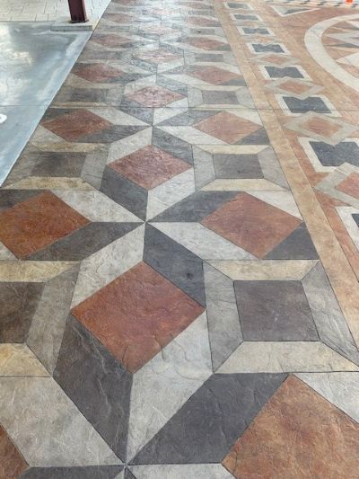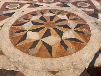 This nearly 1600 SF project is located at the Decorative Concrete Institute facility in Temple, GA. The first step was to stamp a 6" slab with buff integral color using Roman Slate seamless texture. The design was based off a 200-year-old basilica floor in Venice, Italy and has six key elements: the inner medallion, along with different three-dimensional patterns. Once the design was laid out the entire pattern was cut free hand using a 4" angle grinder. Six colors of acid stains were used at varying degrees of dilution. Once the coloring was complete, the surface was cleaned and neutralized, and dry, multiple applications of siloxane modified methyl methacrylate clear sealer were applied.