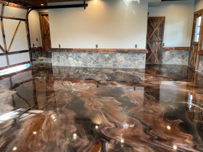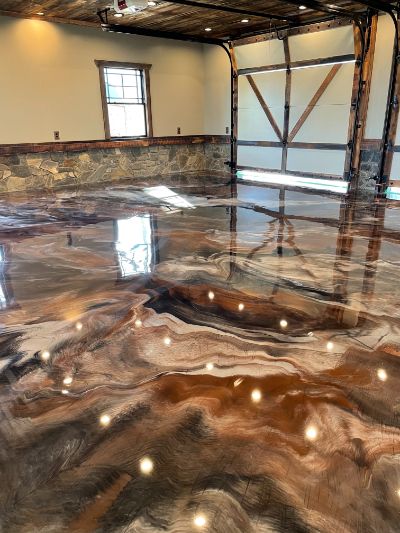 The customer chose a brown, gray and black metallic epoxy to cover a cracked garage floor. An epoxy with a long pot life was selected to give the material plenty of time to flow together, producing distinct veins of color.