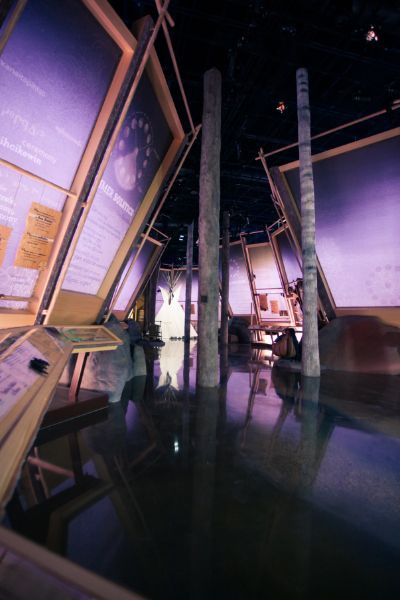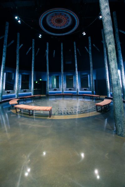 The Indigenous Peoples Experience is the story of Edmonton’s river valley. This canvas of a floor was ground and polished to difference depths; exposing texture to embody the banks of the river. The penetrating dye formed the markings of animal prints, lot lines, and text. The entire project was laid out in full scale with massive rolls of paper as the floor had to line up with the set pieces to be installed later.