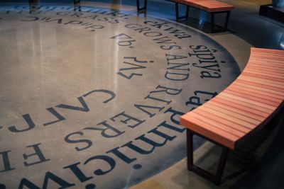 Words from Treaty 6 encircle the gathering space; stark reminders of commitments made. Laid out with giant multi-part stencils and cut by hand, each letter was thoughtfully installed, the gravity of the project never escaping the workers.