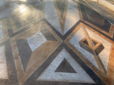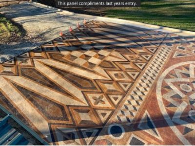 This project was based on a Basilica in Venice that the owners love. The design was installed over integrally colored concrete textured with seamless tamps. Six colors of acid stain were used with varying dilution ratios. The project was particularly challenging because it was stained in the winter when stains react and absorb more slowly. The concrete also has significant slope which meant the stains could not be over applied or they would run and wick onto the adjoining pattern.