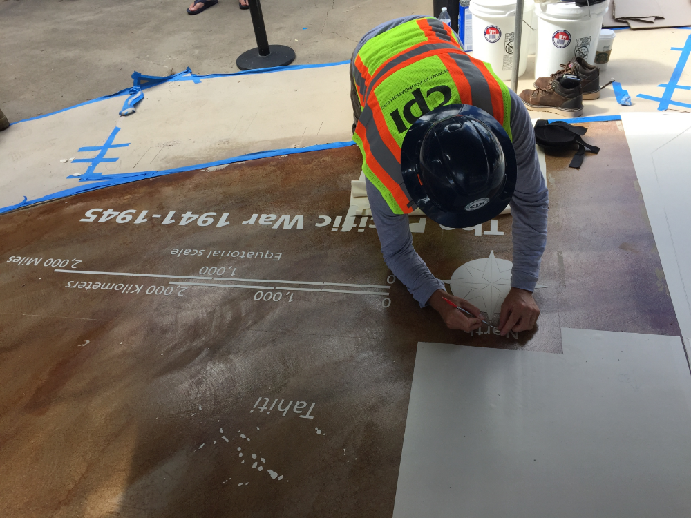 Clark Branum, Diamatic, USA, was the project coordinator to replace a vinyl “sticker” of a map of the Pacific War 1941-1945, with a concrete version at the Pearl Harbor Visitors’ Center. This project was a partnership between ASCC and the Concrete Preservation Institute (CPI). The project consisted of removing the existing vinyl map and substrate, and replacing it with new, colored concrete. Stencils were used to mask the land masses and text prior to sandblasting the surface.