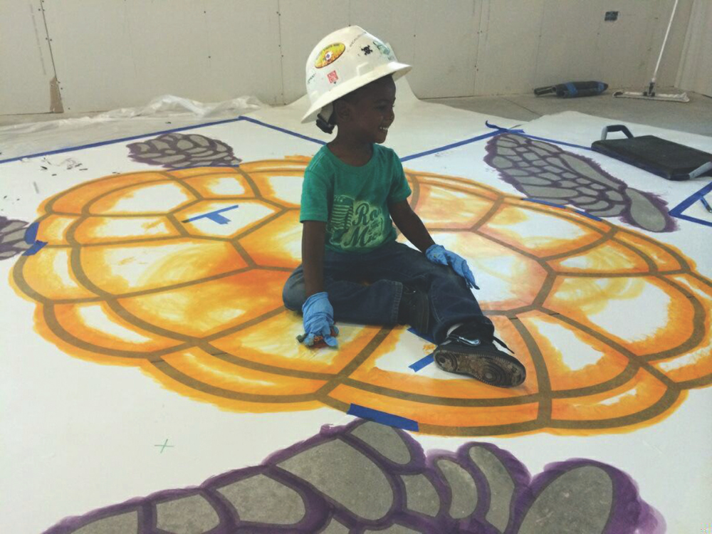 ASCC/DCC member Creative Construction by Design, Danville, IL, was the concrete contractor for a new building in Chicago that serves as a home with free day care for teenage mothers. CCD enlisted help from fellow DCC members and others to give the children floors that would be safe and soothing, yet fun. Volunteers prepped the floors and installed overlay coatings on top of the gray concrete. Metallic epoxy colors were applied on top of overlays and “blown” with a leaf blower to provide a dramatic, layered finish. Sea creature stencils were installed by Rachel Krigge Bruce and Rick Lobdell.