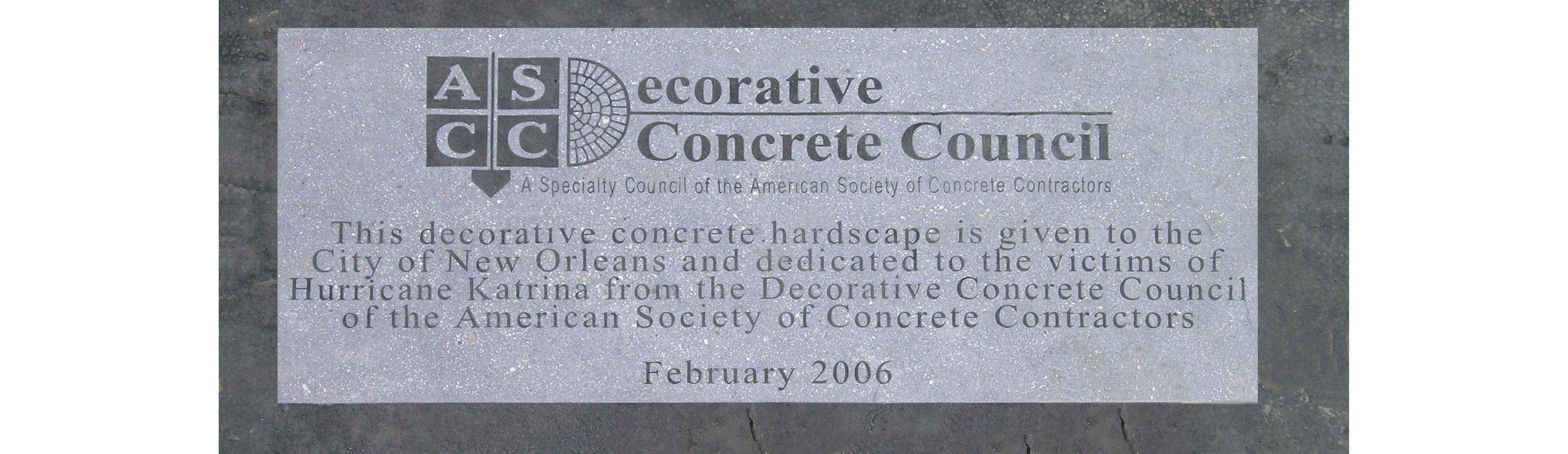 Approximately six months after Hurricane Katrina touched down in New Orleans, members of the DCC from all over the country met there to rehab the hardscape portions of a triangular shaped park at the intersection of Rue Tchoupitoulas and Rue Religious, near the NOLA Convention Center. Sidewalks leading to a circular centerpiece were stamped and stenciled. A memorial to the city was sandblasted into the center of the circle. The completed park was dedicated on March 18 as part of the DCC EXPO 2006, one of the first major events held in the city after Katrina.