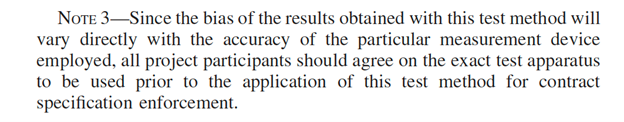 At first glance, one might get the impression that all project participants would hold a meeting to discuss, then agree on the exact test apparatus (e.g. laser imaging device, leveled straightedge, "Dipstick", and so on) before embarking on any test program that will be used to enforce contract specification compliance. Presumably, this mutual, sensible agreement among all project participants could be reached--using pre-bid RFI's--during the bid period. In practice, however, it is more likely that such discussion and agreement would be reached during the preconstruction conference.